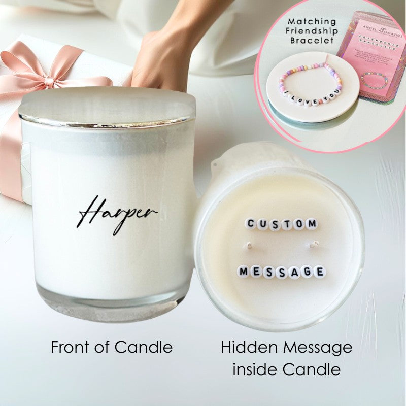 ADD A FRIENDSHIP MATCHING BRACELET Recreate your hidden message with this adorable friendship bracelet. Inside the pack are letter beads and selected colour beads with elasticised string. Burn the candle to reveal the message within an hour then make your bracelet to match.