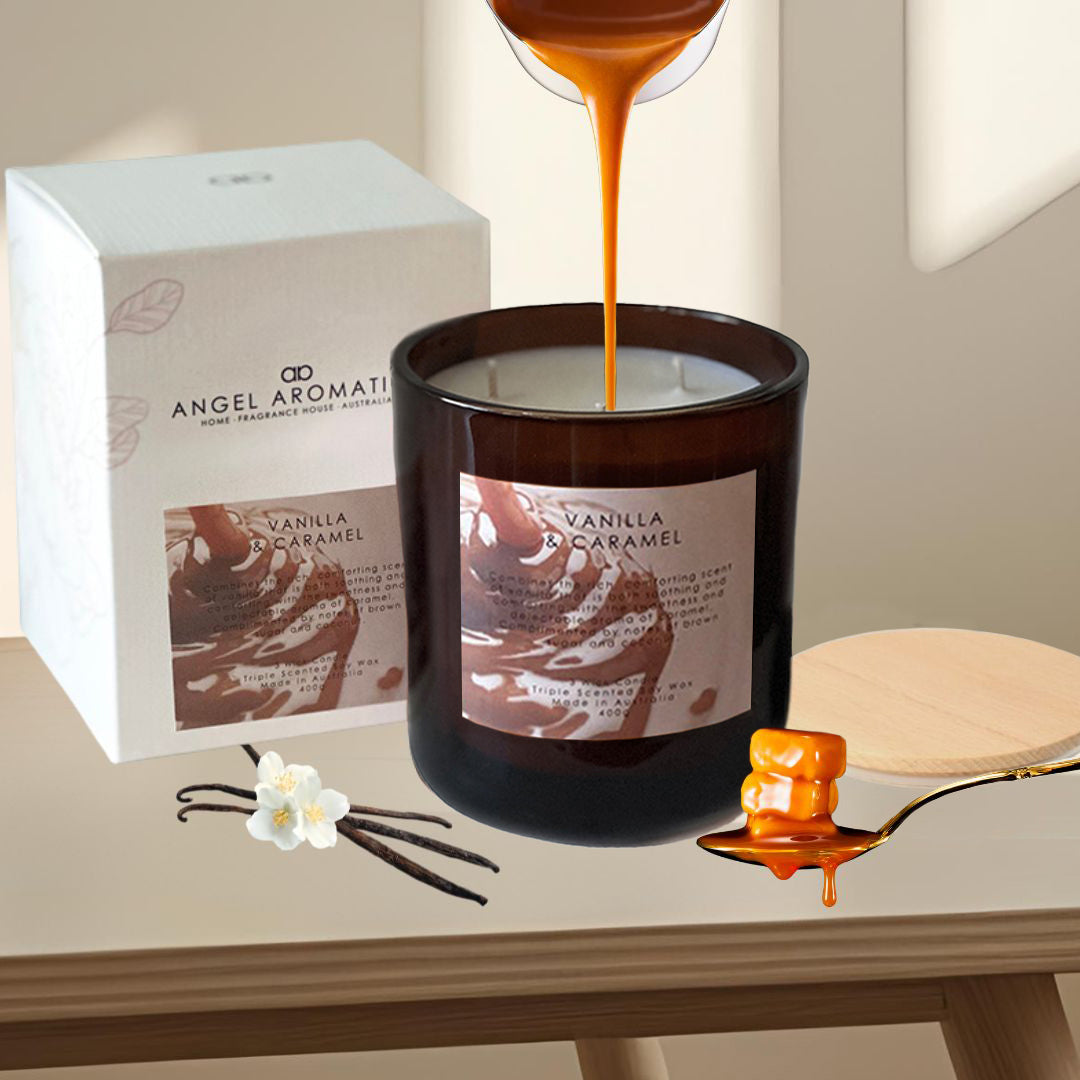 NEW to the range Vanilla Caramel scented candle is a delightful fragrance blend. This aromatic candle combines the rich, comforting scent of vanilla that is both soothing and comforting with the sweetness and delectable aroma of caramel, complimented by notes of brown sugar and coconut.